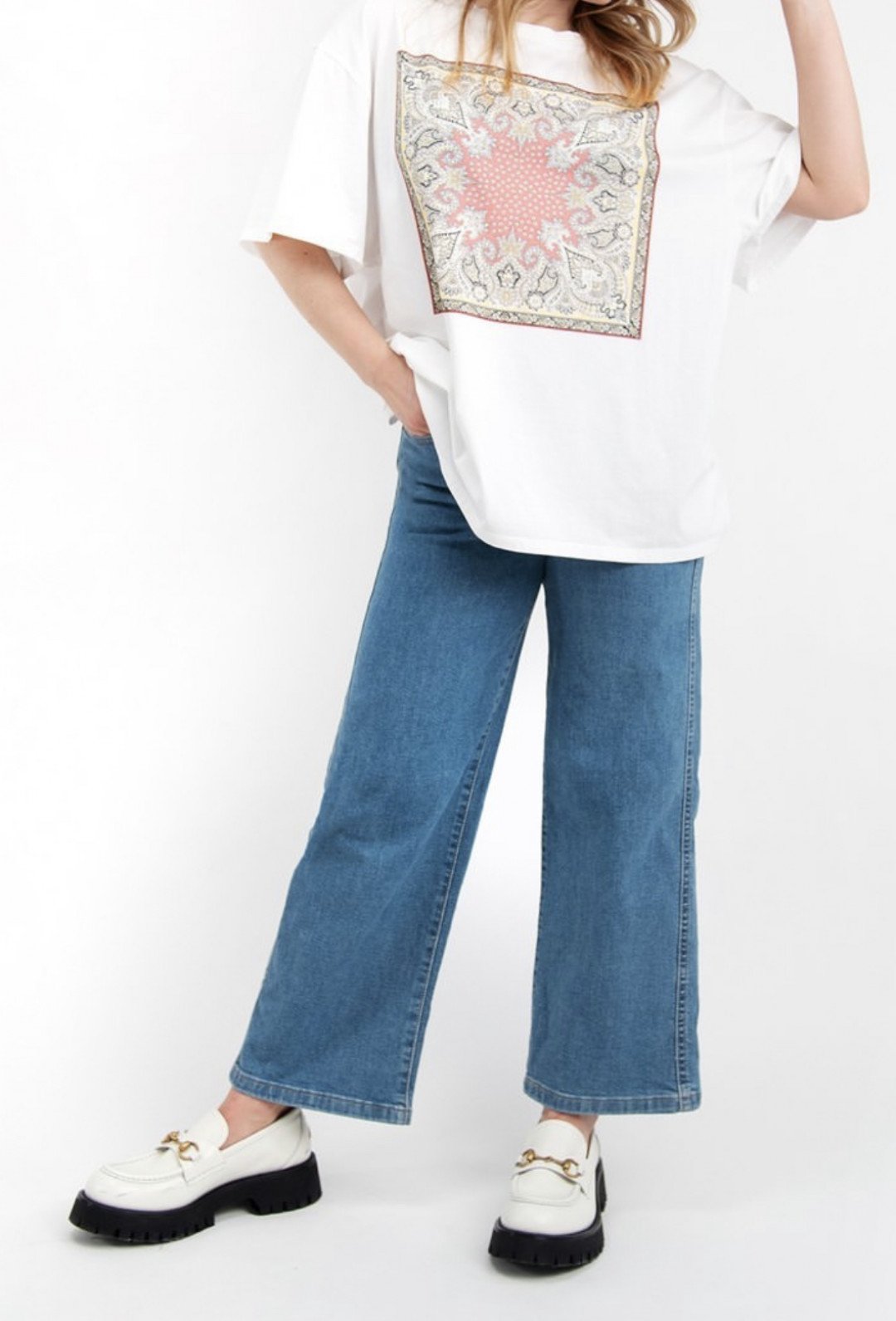 A crew neck tee with a bold T.W.I.N. print and contrast border. Oversized sleeves and a relaxed fit make it breathable and bra-friendly, with a soft neckline for all-day comfort.