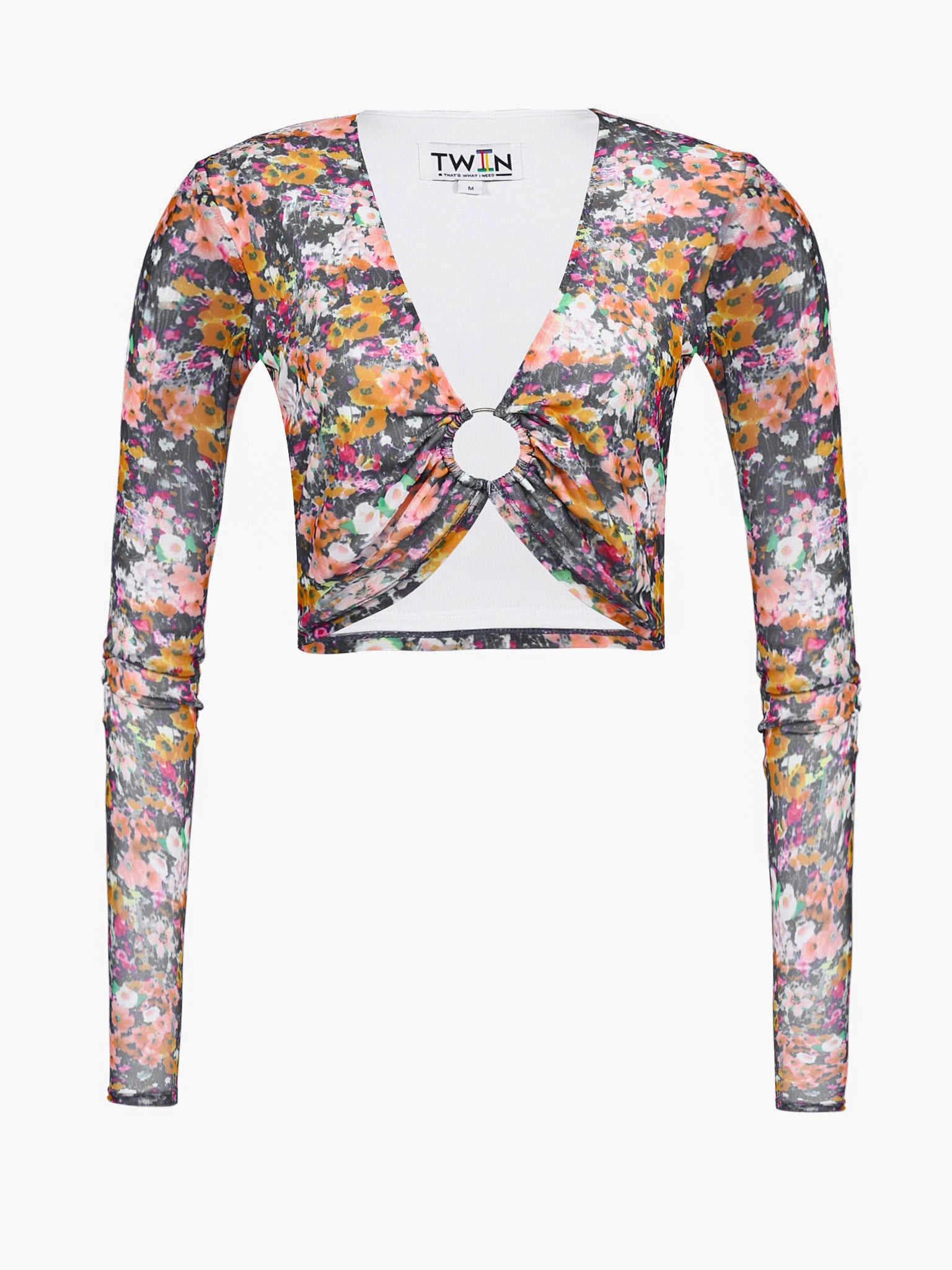 Cropped and confidently bold. This long sleeve top features a deep V-neckline, a standout metal ring detail, and built-in nylon-spandex lining for extra support.