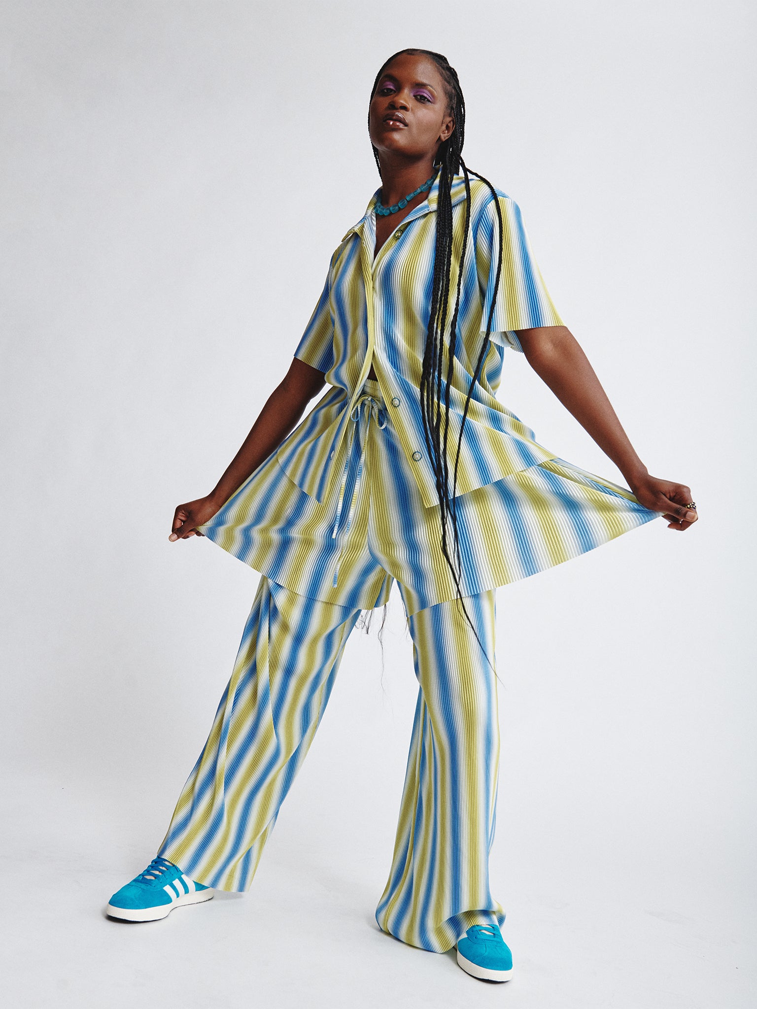 Made from deadstock 100% Polyester—lightweight, low-fuss, and built to last. This style fits oversized. Marquis wears a size XL in White/Black/Citron; Madeleine wears a size M in Citron/Blue. Machine wash cold, hang to dry. Imported.