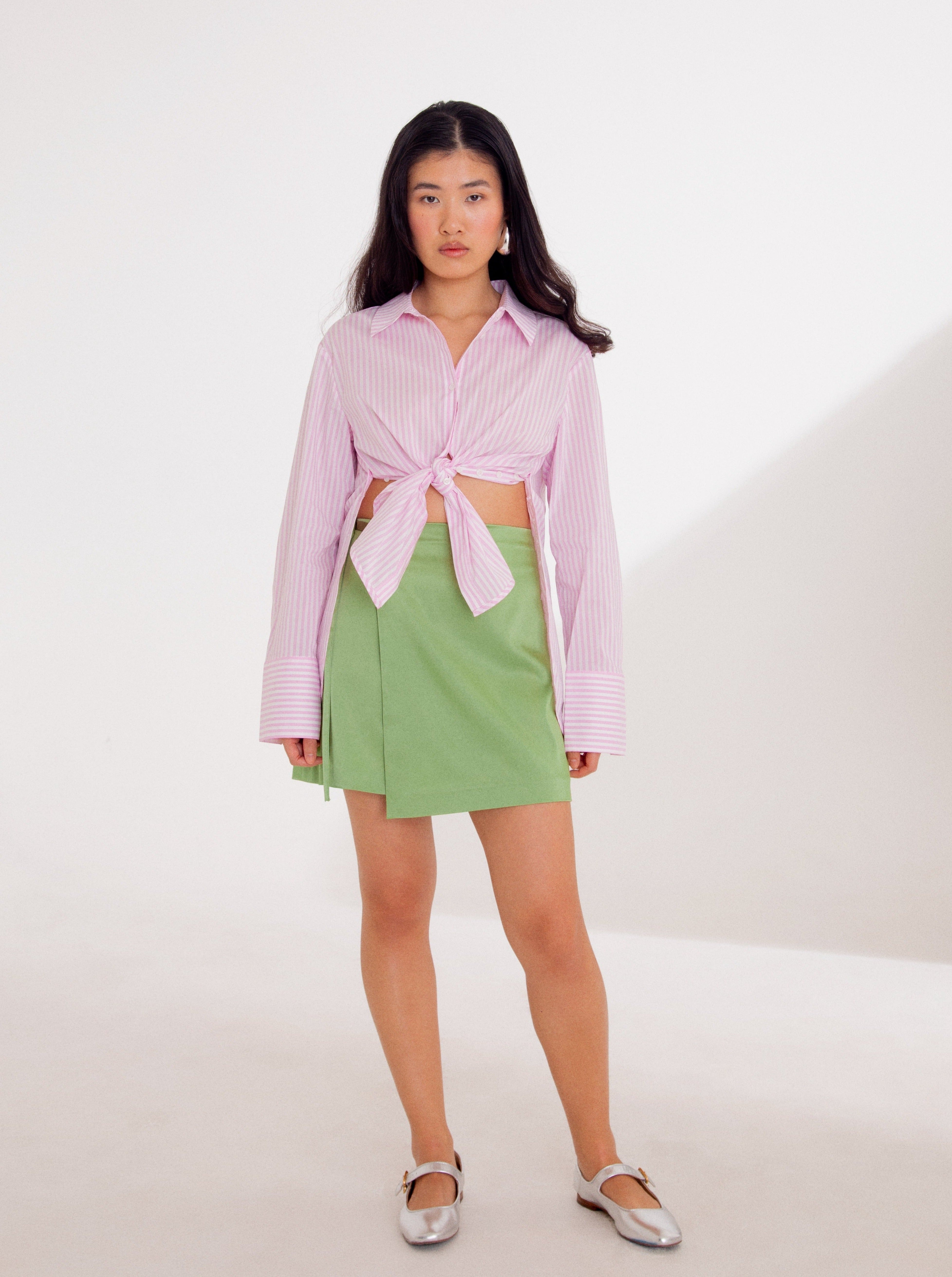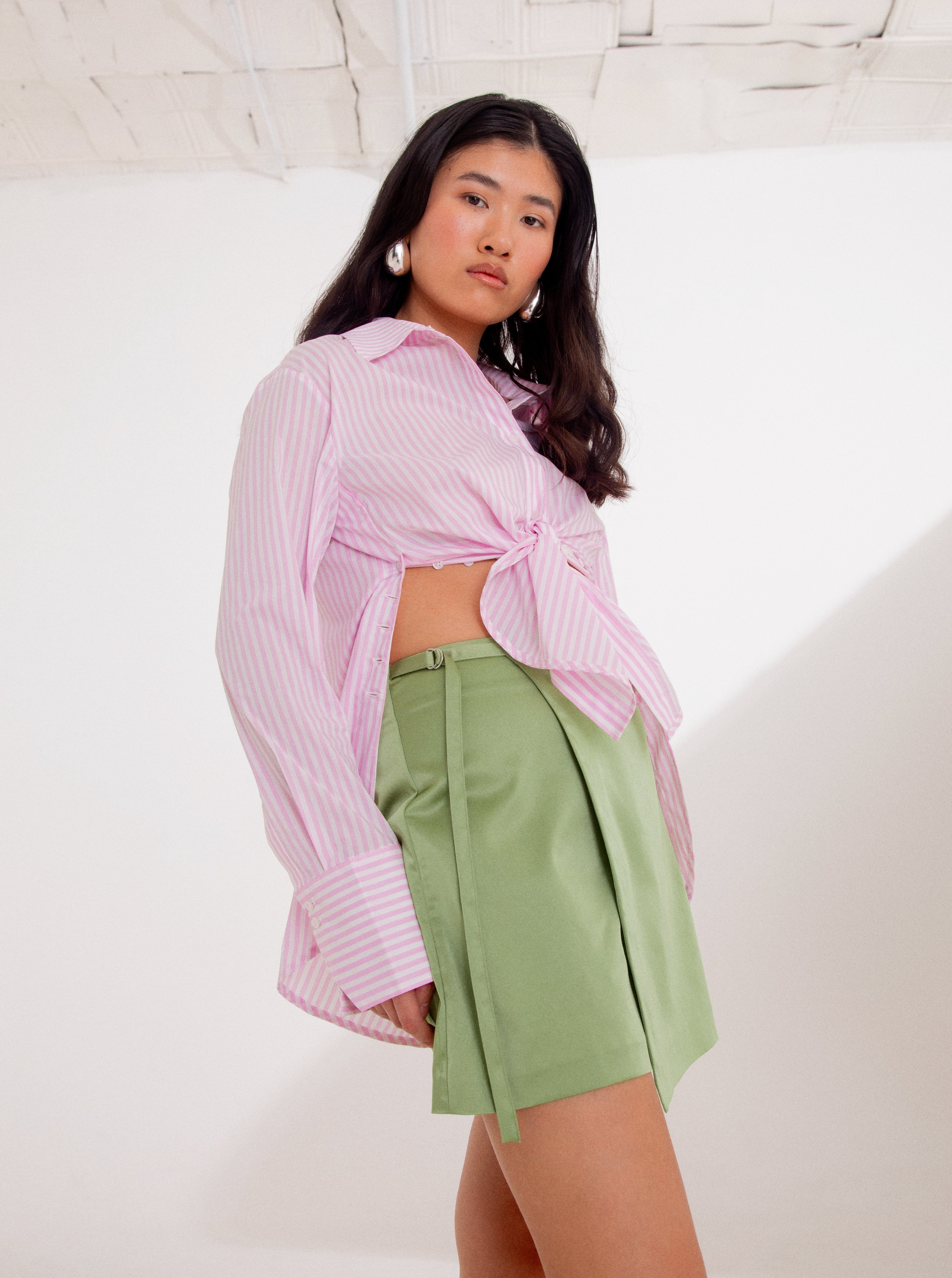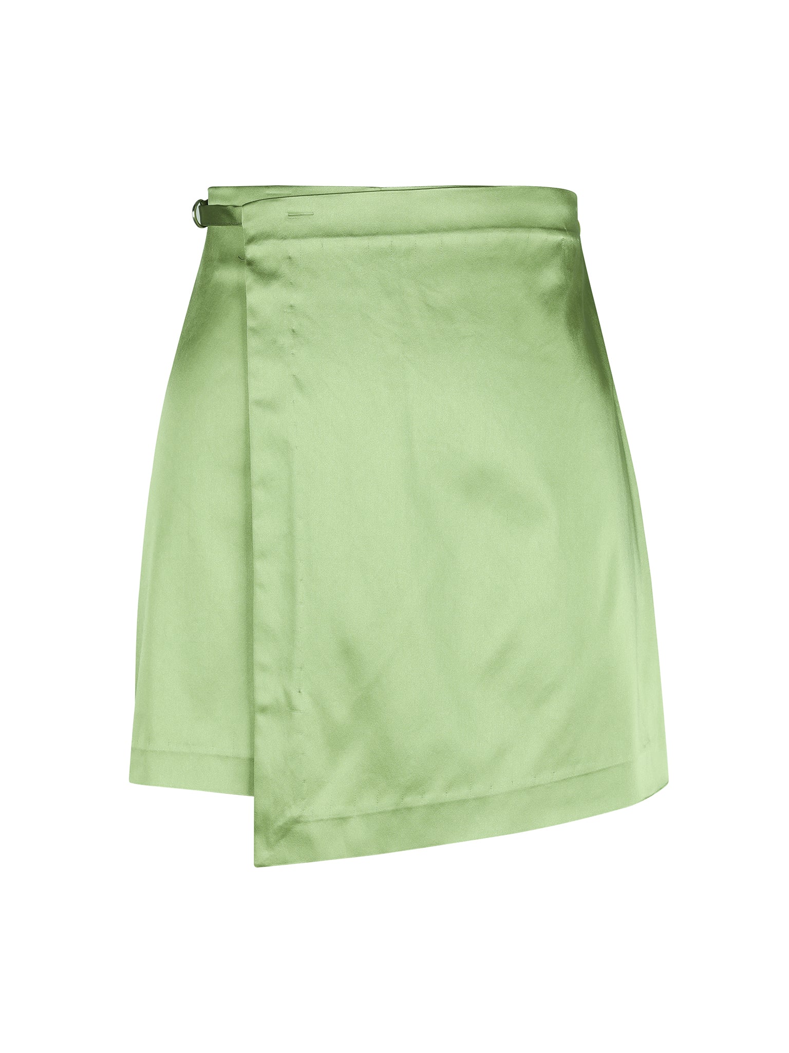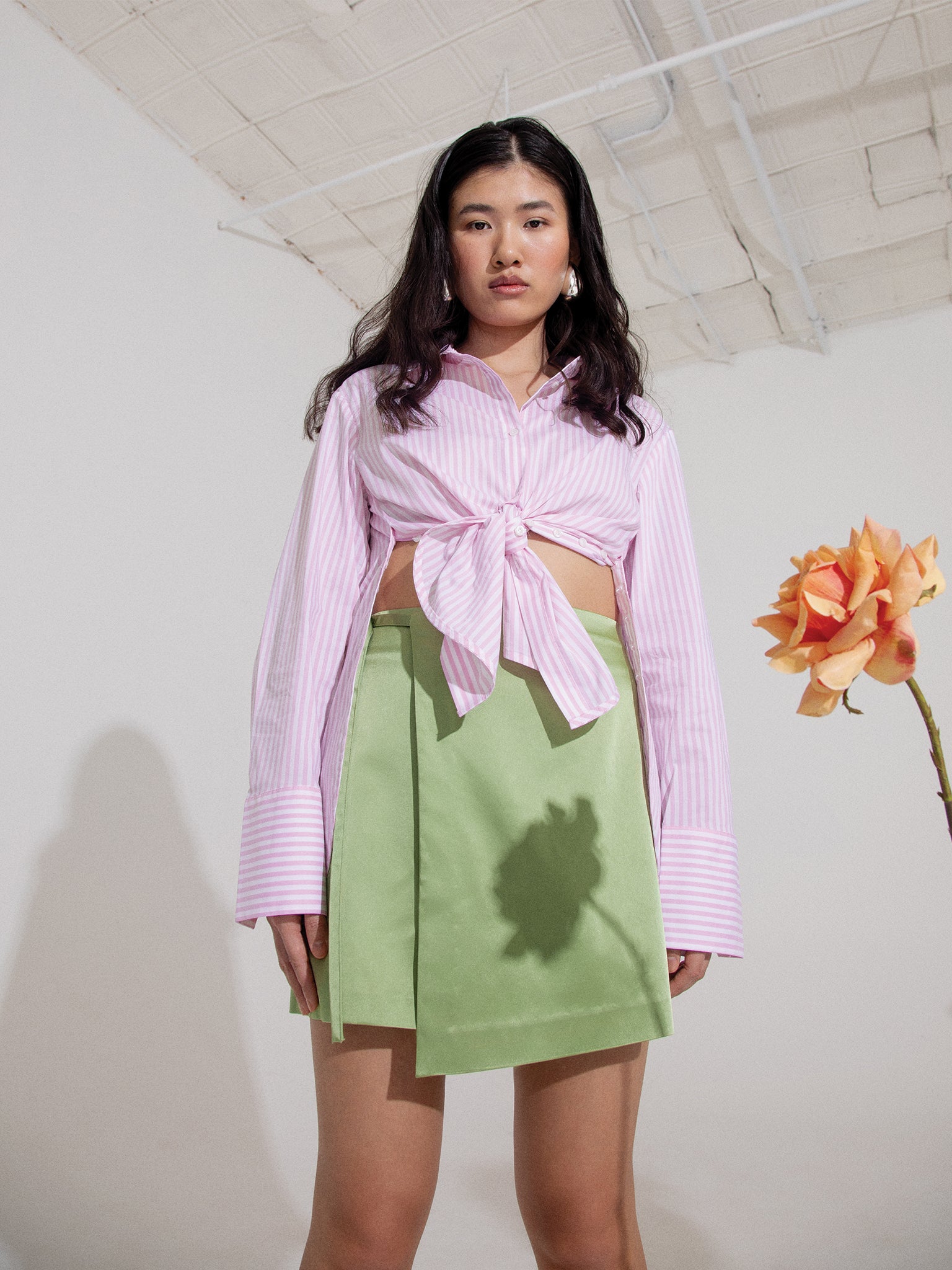 Cut from deadstock stretch satin—71% Acetate, 29% Polyester—for a sleek, soft finish. Fits true to size. Feifei wears a size S in Pistachio. Dry clean or hand wash only. Import.