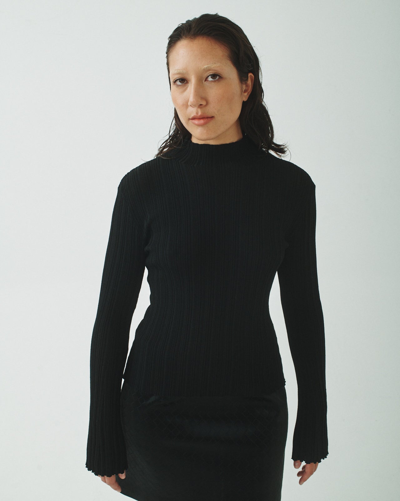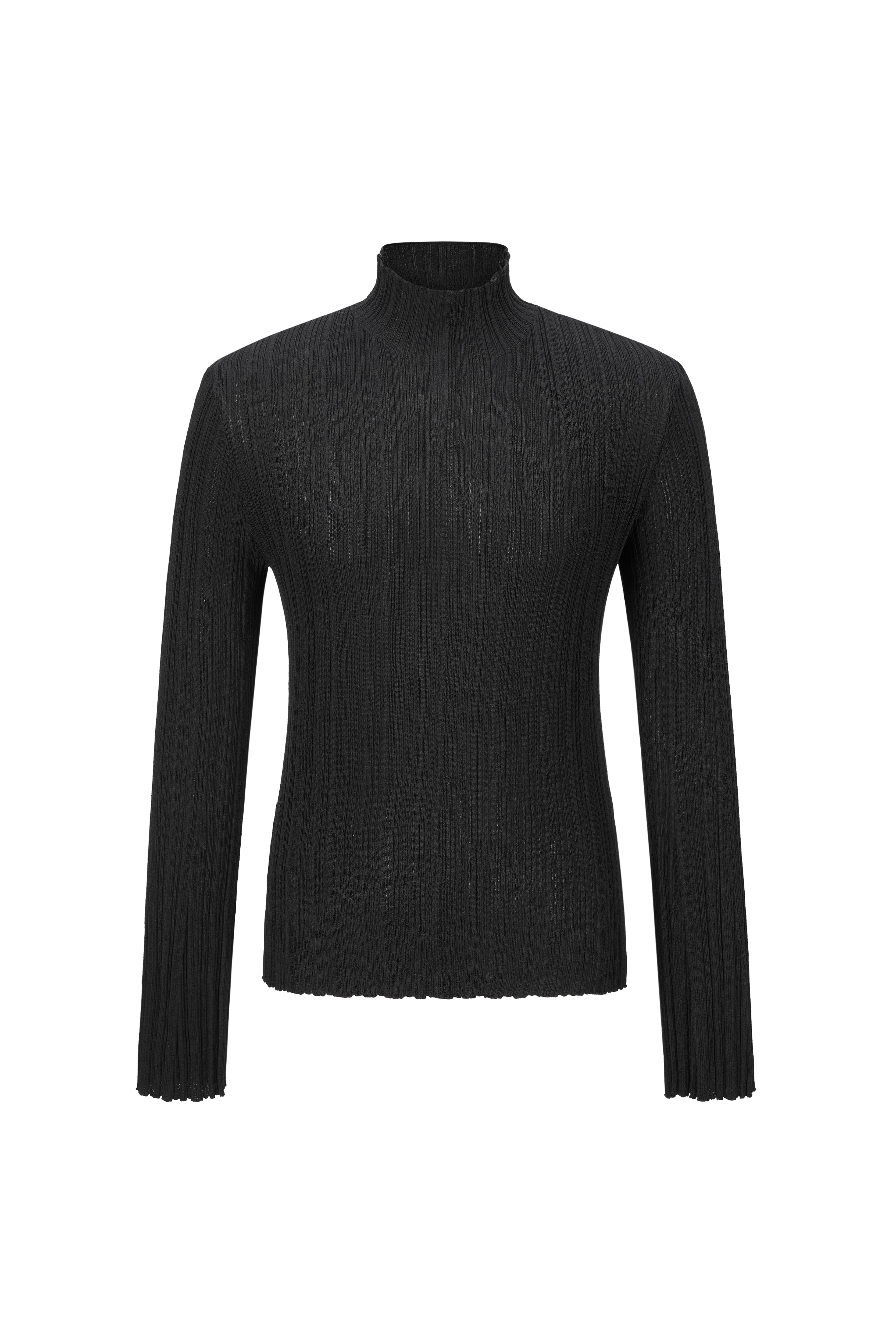 Knitted with a mock neck, pleated texture, and flared sleeves for a bold, sculptural silhouette. Soft structure meets standout detail.