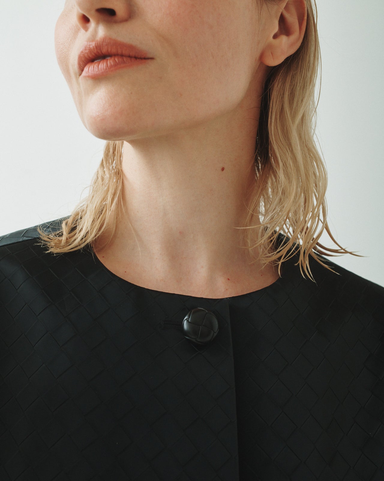 Designed with a classic crew neck and a three-button front, this cropped top features a boxy fit for a modern, structured silhouette.