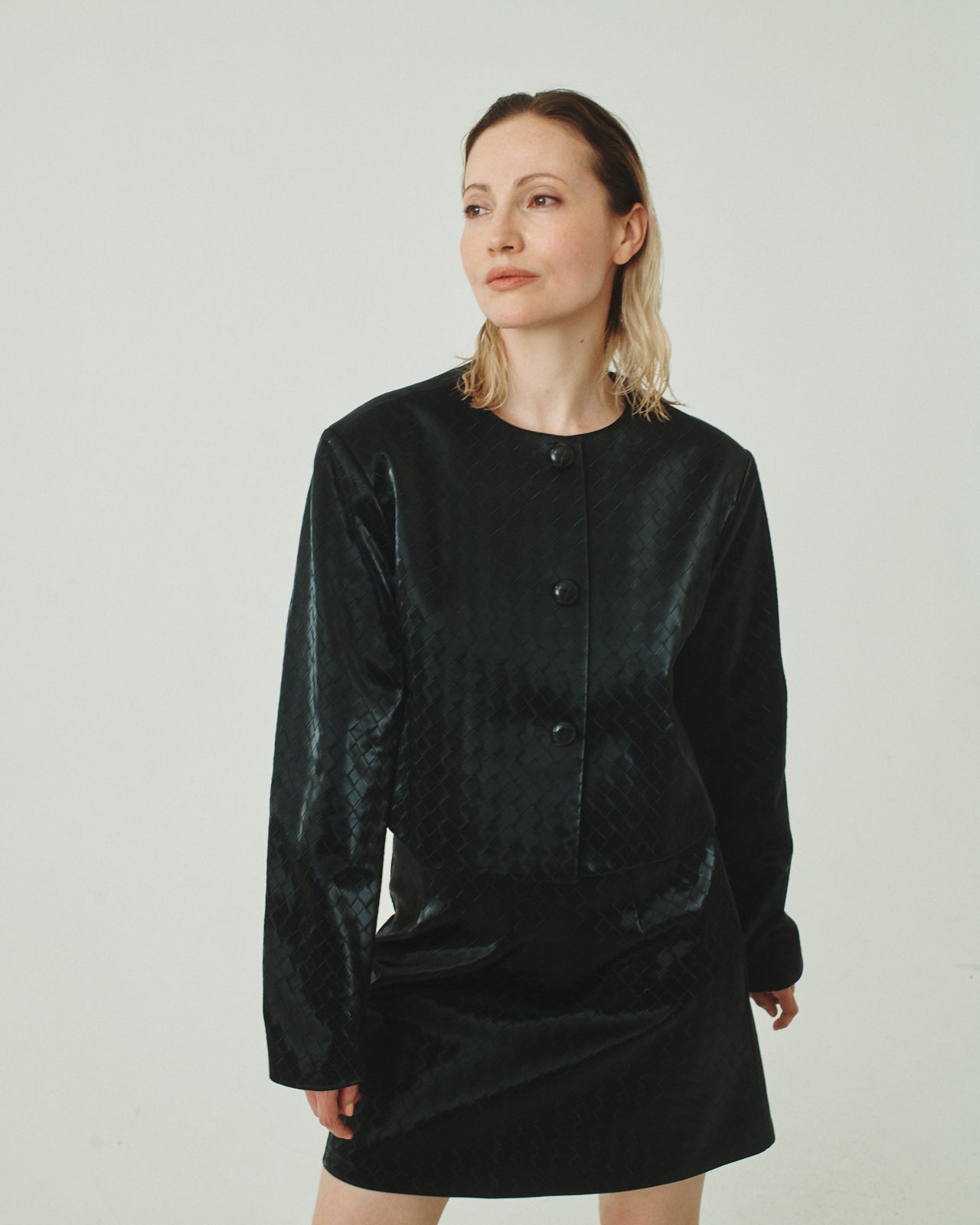 The WOVEN JACKET answers the question: what happens when Bottega + Chanel have a baby? Woven texture fabric gives this boxy, cropped, three-button jacket the perfect blend of contemporary and traditional. It's the consciously made jacket you'll need to add to your closet. This style fits true to size. Francesca is wearing a size M in Black.
