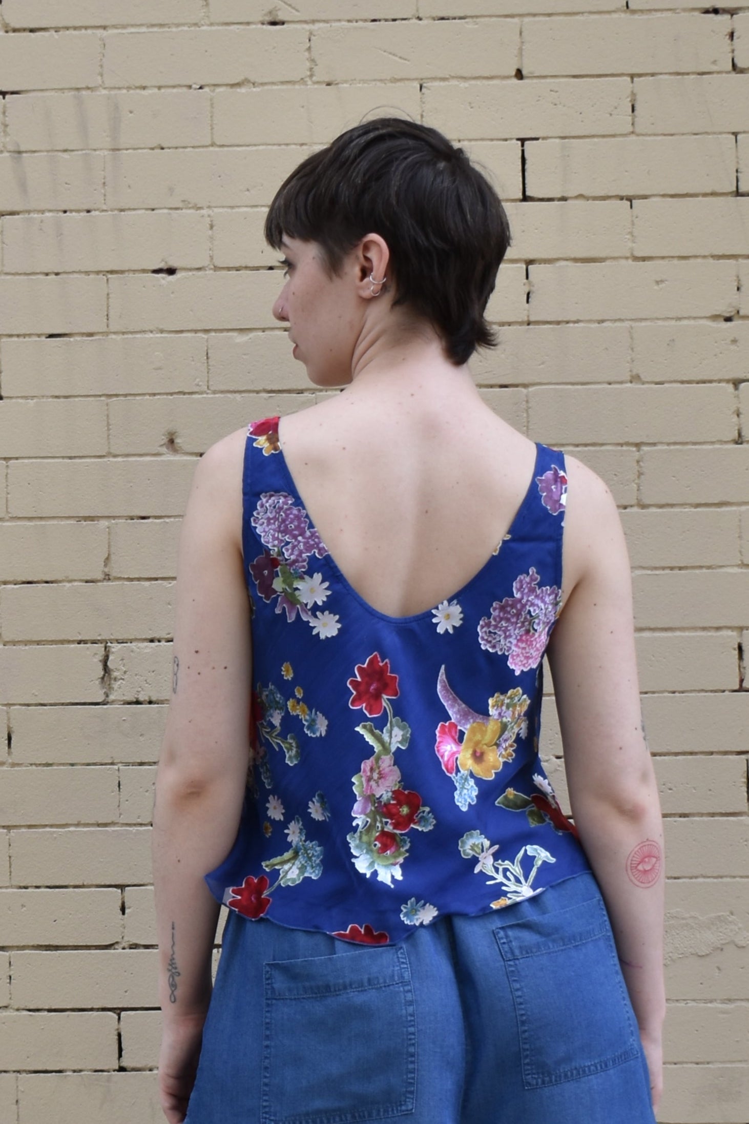 This breezy top features a 19.5" length from shoulder, a scoop neckline, and a relaxed fit that’s both bra friendly and breathable. Unlined and made from deadstock fabric, it offers effortless comfort and versatility.