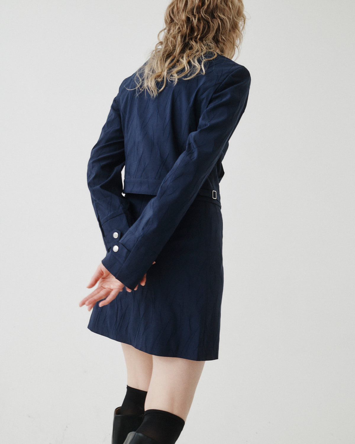 Micro Houndstooth print is crafted from deadstock 64% Polyester 34% Rayon 2% Spandex, and Navy Jacquard from deadstock 74% Rayon 22% Nylon 4% Spandex. Machine wash cold, lay flat to dry. Cold iron or steam when needed. For best results, dry clean.
