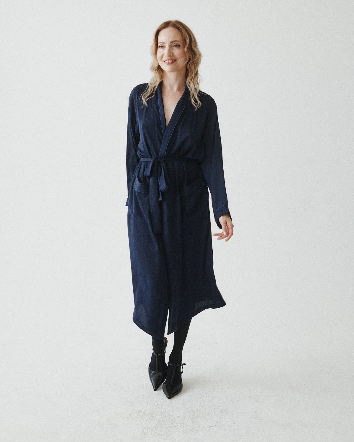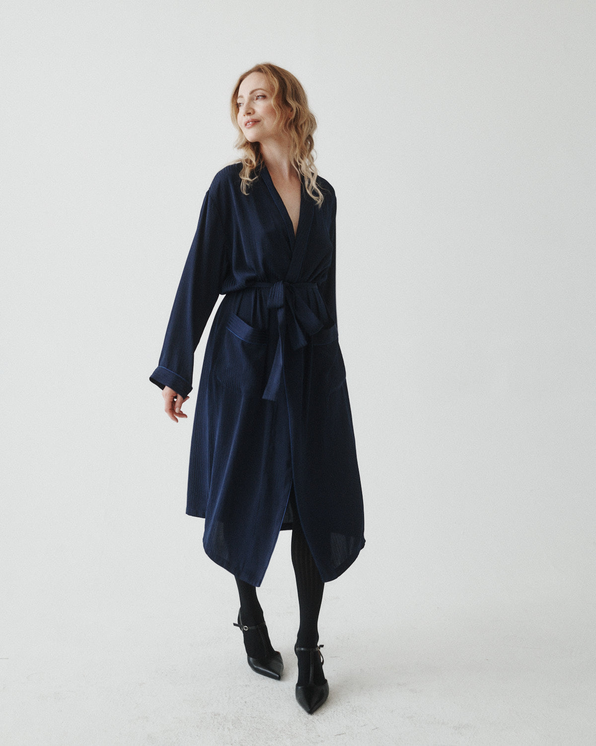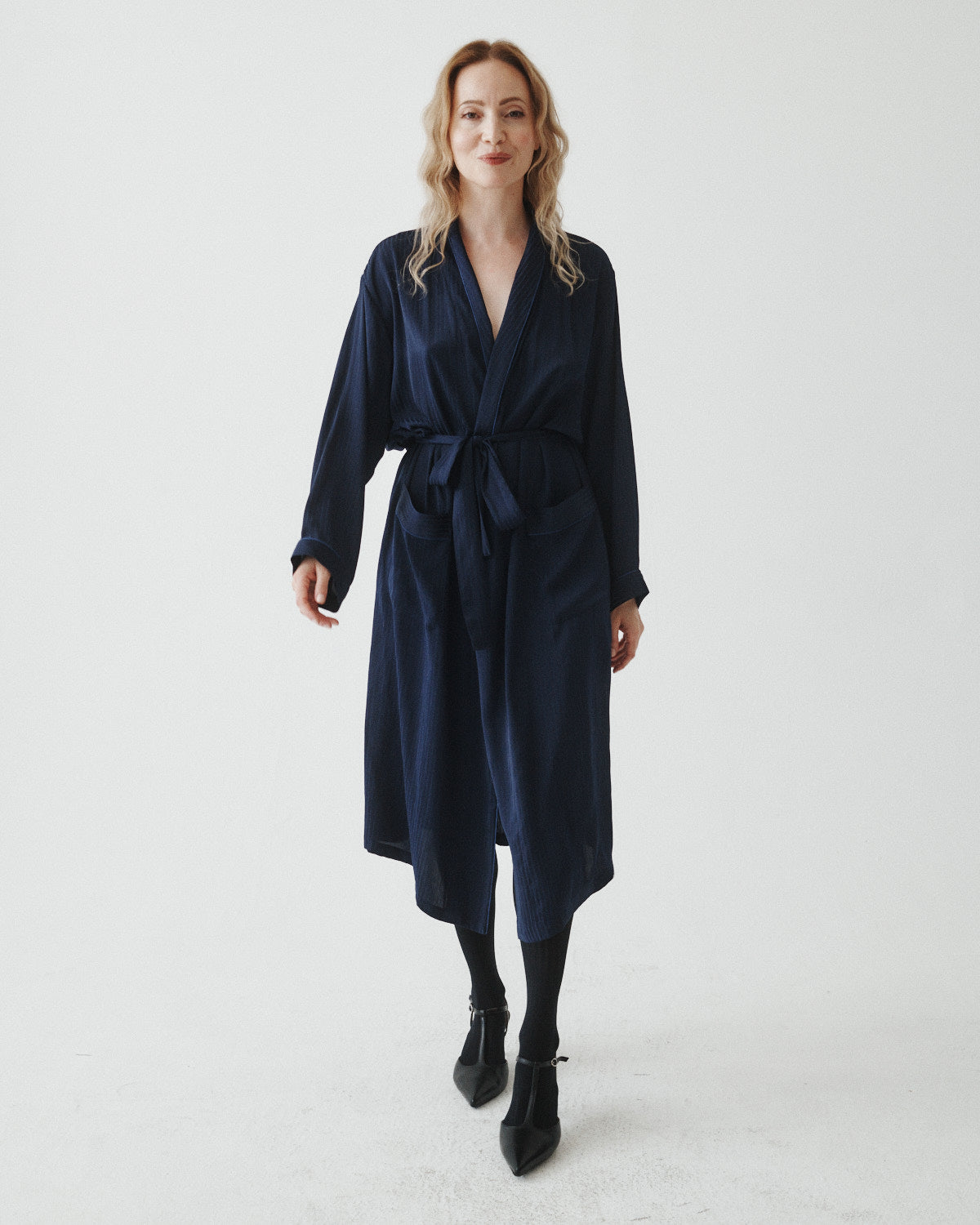 This versatile midi-length satin piece features a removable belt, satin piping, and a smooth drape that can be styled as a dress, overcoat, or layered look.