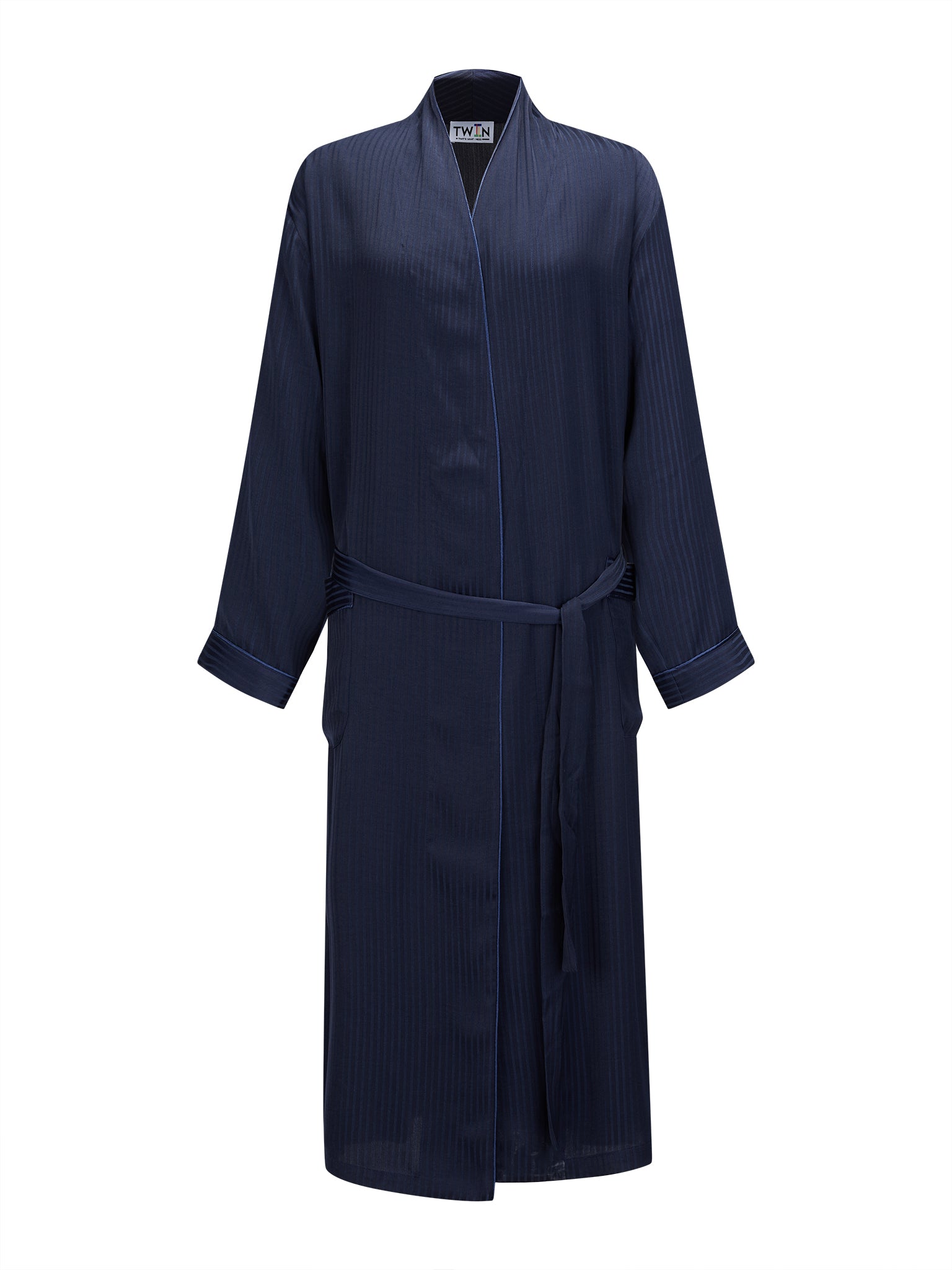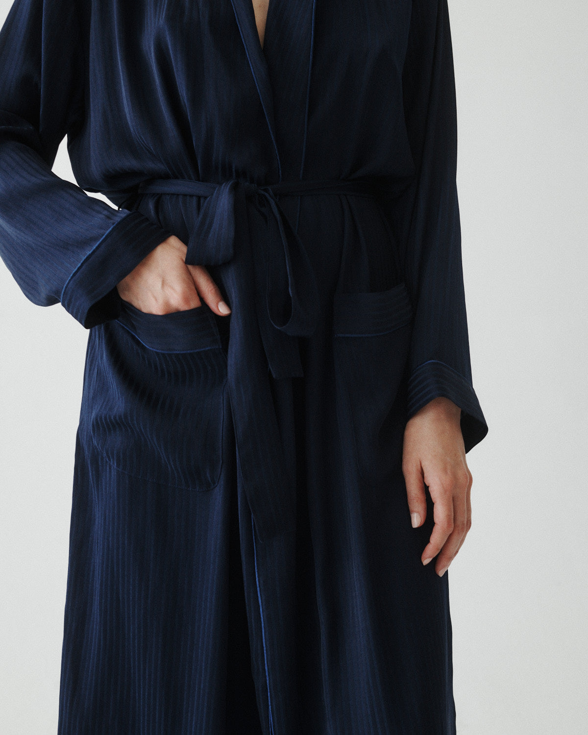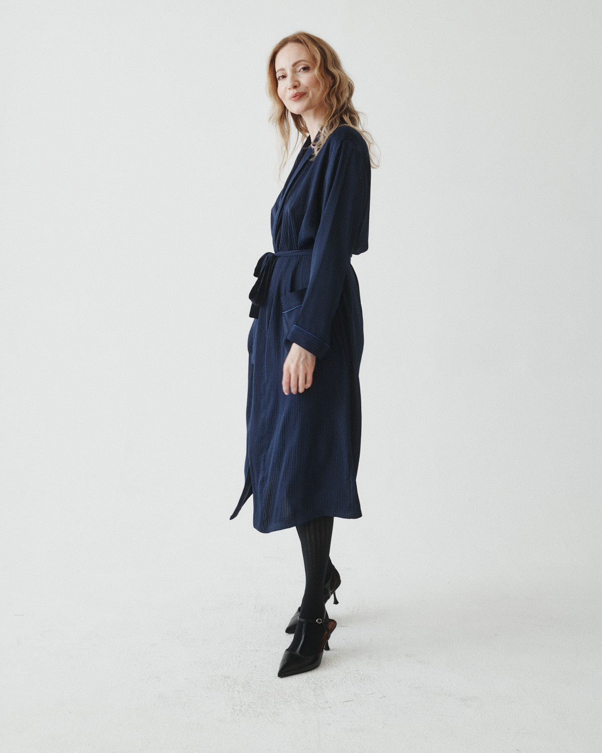 This versatile midi-length satin piece features a removable belt, satin piping, and a smooth drape that can be styled as a dress, overcoat, or layered look.