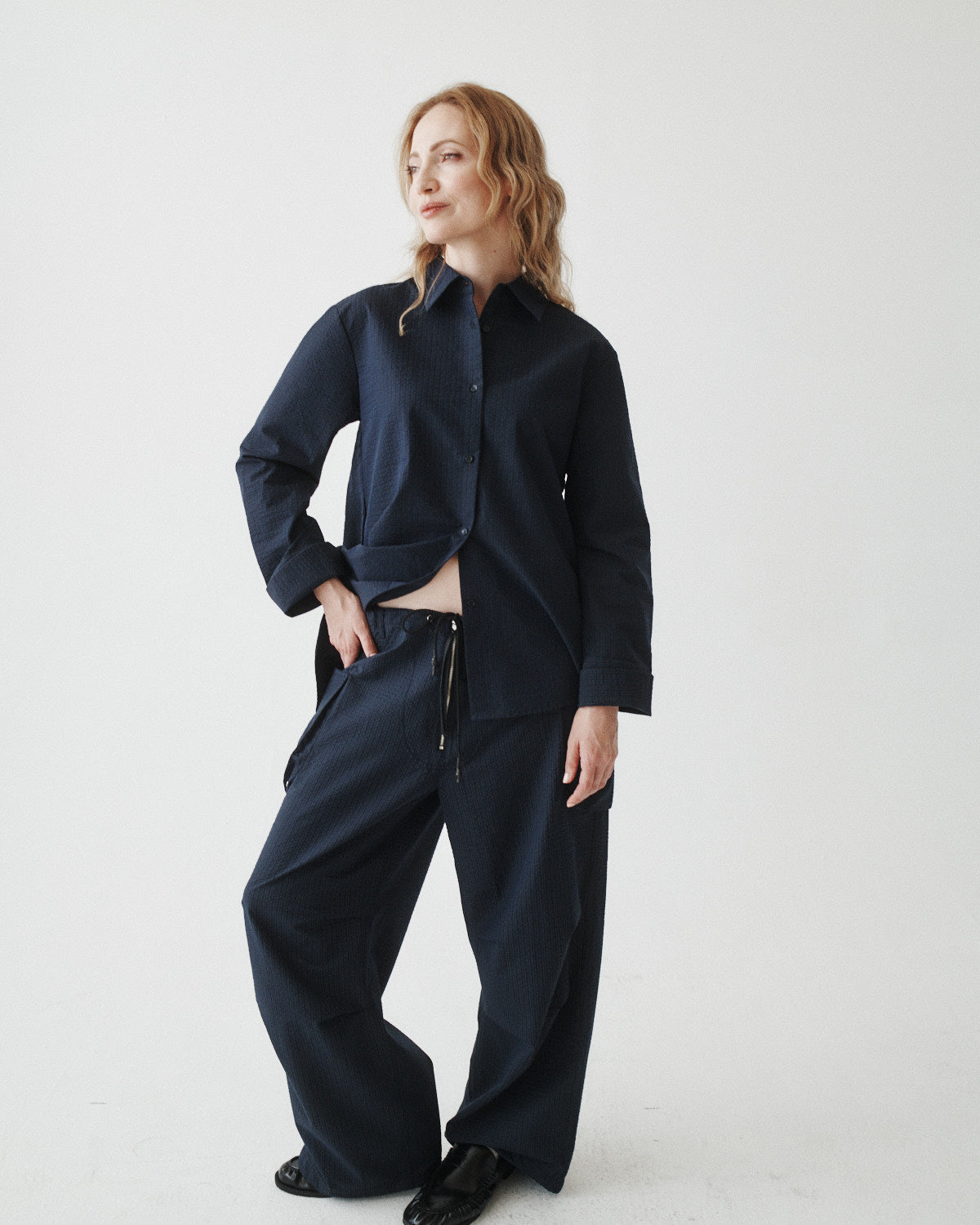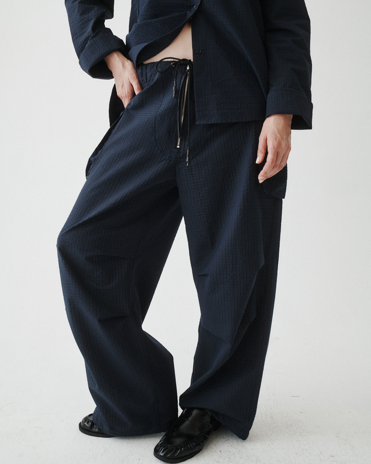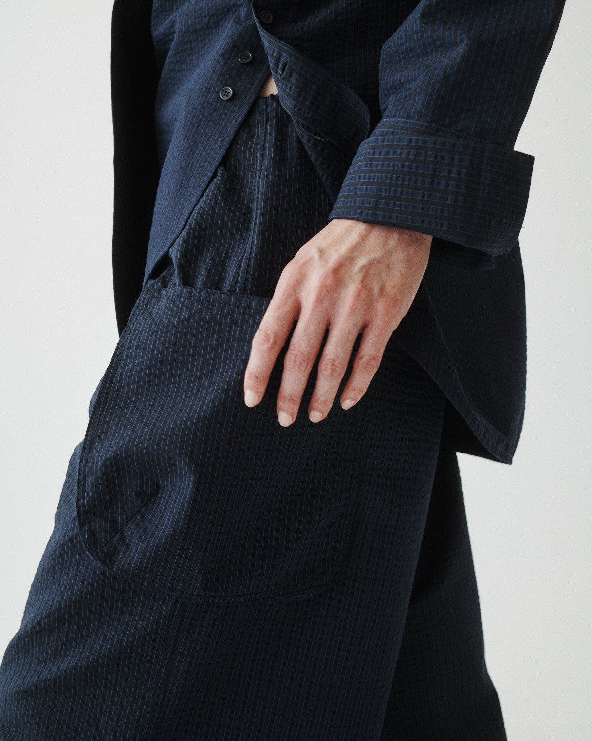 We're all obsessed with the CARGO PANT, now available in a seersucker stripe. It's almost as if we took your dad's favorite pants and made them fit perfectly. Worn low, mid or high rise these pants are exactly what you need PLUS pockets. This style fits true to size. For a mid-rise fit, take your usual size. For a low-rise look, size up.