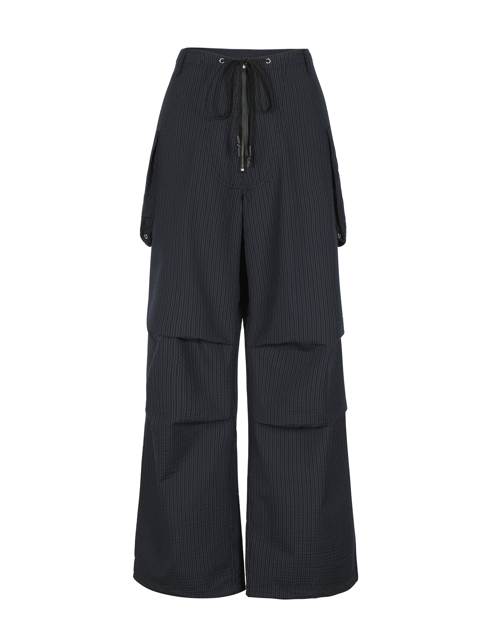 Cargo pants with a zipper fly, adjustable drawstrings at the waist and ankles, and darted knees for shape. Designed with two large cargo pockets and belt loops at the waistband for added utility.